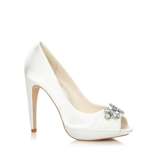These ivory satin court shoes from exclusive designer Jenny Packham have a peep toe with an elegant lace and jewel flower trim. They offer light cushion support and have a banana style stiletto heel with a platform sole.